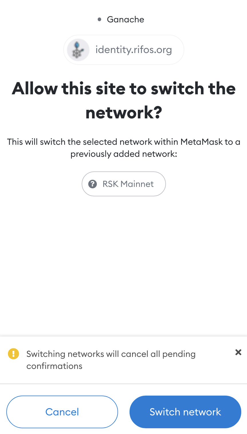 Alternatively, you can do this automatically, by visiting identity.rifos.org, and when you attempt to connect using MetaMask, you will get presented with the following: