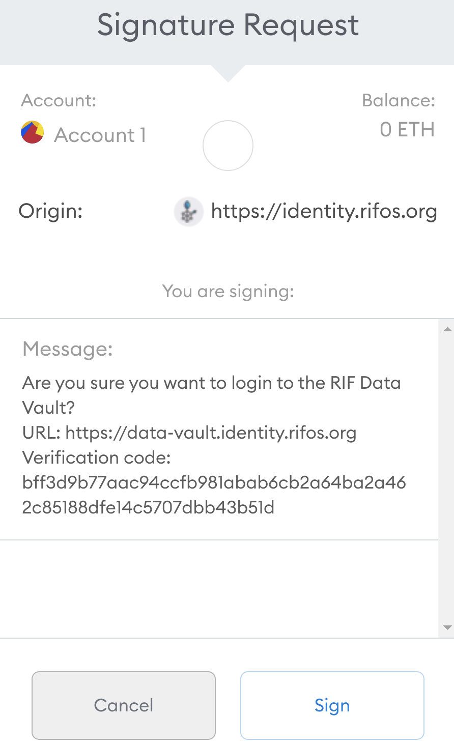 This is where the RIF Identity Manager comes in! This DApp allows you to verify whether we control this address. You'll do this by signing a message that is not a blockchain transaction.